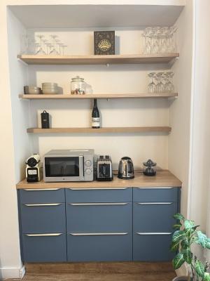 Climatisation. Lave linge. Lave vaisselle. Four. Micro ondes. Plaques : à induction. Machine à café : oui. Hotte aspirante. Toaster. Refrigerateur. Congelateur. Autres : Les climatisations se trouvent dans la salle à manger et le salon.