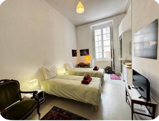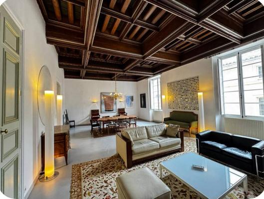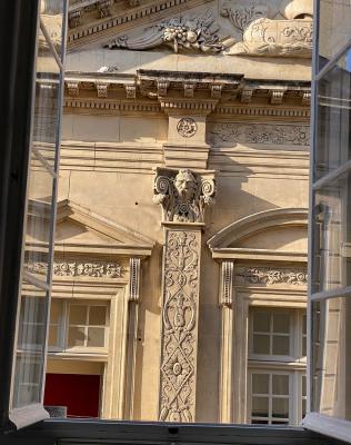 L'appartement se situe au deuxième étage d'un ancien hôtel particulier construit en 1540 et se situant en face du théâtre des Gémeaux.