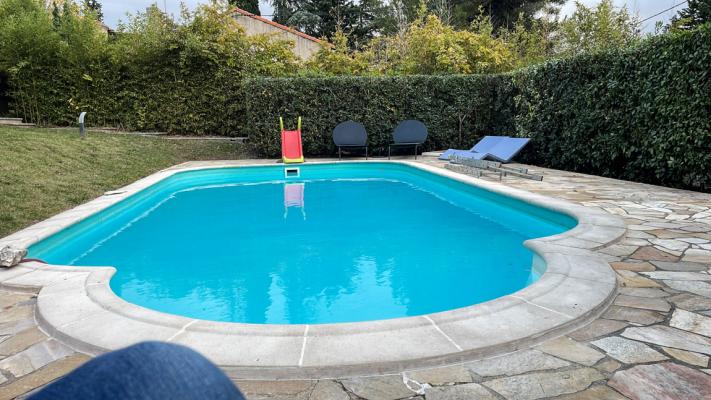 Stationnement : plusieurs places. Piscine : liner. Dimensions : 8 par 4. Espace vert : jardin clos et arboré. Terrasse: avec store. Barbecue : en maconnerie. Transat. Tables et chaises. Portail électrique. Pétanque.